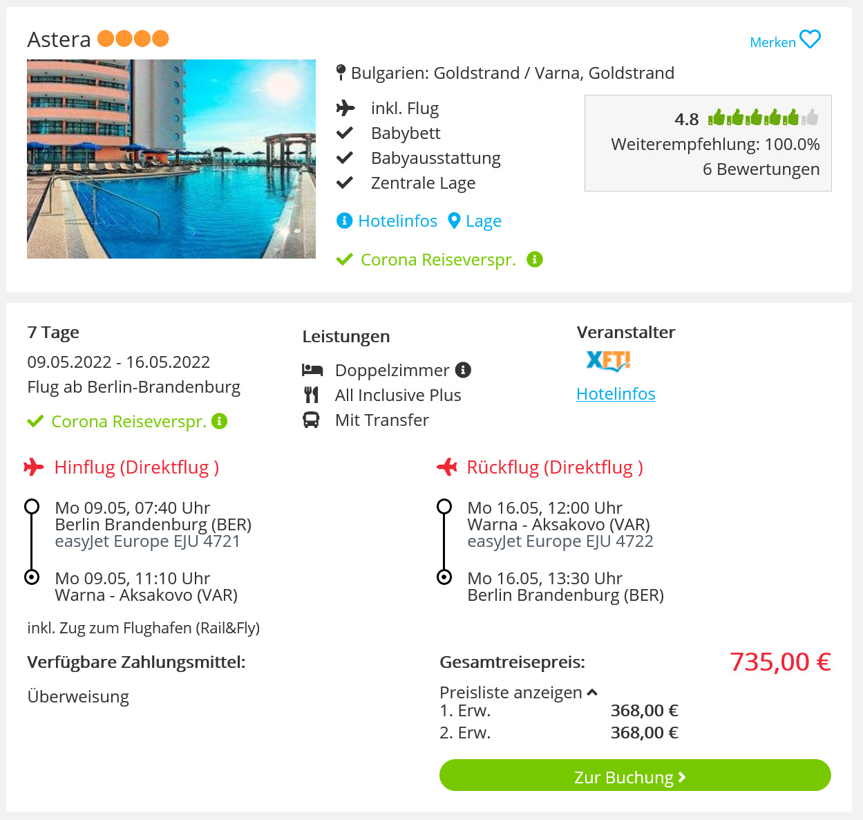 Jetzt schon den Sommerurlaub für 2022 buchen und jede Menge sparen: Mit unserem heutigen Reise-Deal geht es im Wonnemonat Mai für eine Woche ins 4-Sterne-Hotel an den Goldstrand mit Verpflegung All Inclusive Plus! Und dank des Corona-Reiseversprechens kannst du bei vielen Veranstaltern die Reise kostenlos stornieren oder umbuchen – perfekt für eine sichere Urlaubsplanung trotz Corona!