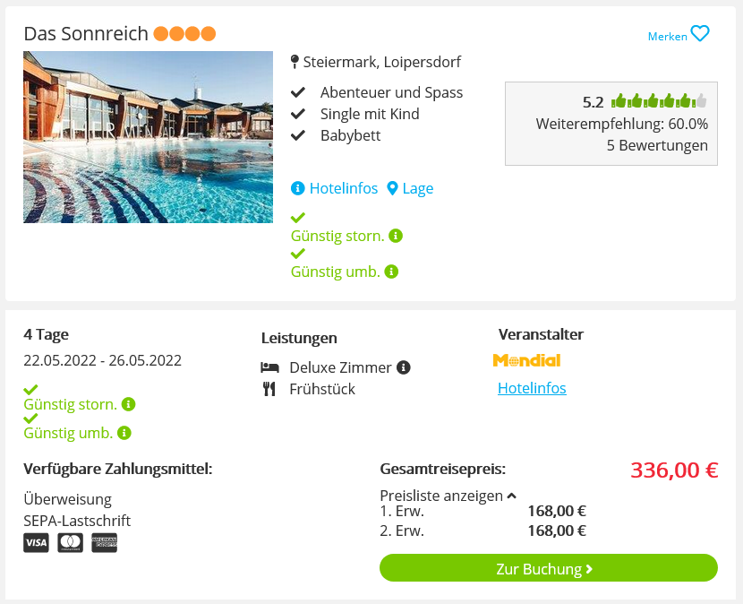 Sie erwartet ein hochklassiges Wellnesshotel, in dem Kulinarik, Erholung und Genuss großgeschrieben werden. Sie können hier Nordic-Walking-Stöcke, Fahrräder und E-Bikes ausleihen, um die Umgebung ausgiebig zu erkunden. Im Wellnessbereich werden Sie von Kopf bis Fuß verwöhnt und über einen direkten Durchgang erreichen Sie das riesige Thermenresort Loipersdorf, zu dem ein Fun Park mit Wasserrutschen, verschiedene Schwimmbecken und zahlreiche Wellnesseinrichtungen gehören.