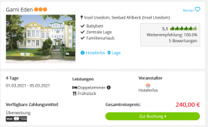 Mit „fabelhaft“ haben Urlaubsgäste das Hotel Garni Eden bewertet, 100 Prozent der Reisenden empfehlen das Hotel auf Usedom weiter. Besser geht’s nicht!