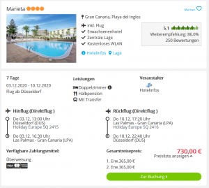 Lust auf ein Last-Minute-Schnäppchen? Mit unserem heutigen Reisedeal geht es zur Reisezeit im Dezember für alle Erwachsenen in den einwöchigen Urlaub auf den Kanaren. Gran Canaria, auch die Insel des ewigen Frühlings genannt, ist das perfekte Reiseziel, um der kalten Jahreszeit zu entfliehen und anstatt Kerzenlicht lieber etwas Sonnenlicht im Advent zu genießen. Was erwartet dich im Adults-Only-Urlaub auf Gran Canaria? Eine wunderschöne Landschaft, ein mildes Klima, zahlreiche Freizeit- und Ausflugsmöglichkeiten und nicht zuletzt mit A B S T A N D und Hygienemaßnahmen auch ein sicherer Urlaub trotz Corona auf den Kanaren. Der Winterurlaub auf Gran Canaria eignet sich vor allem für Ruhesuchende und Aktivurlauber: Schnapp dir deinen Rucksack und erkunde die vielseitige Insel beim Wandern auf den Pico de las Nieves, beim Schlendern durch die Dünen von Maspalomas oder bei Strandspaziergängen in Playa del Ingles. Ein Ausflug in die Inselhauptstadt Las Palmas sollte auf deiner Gran Canaria Pauschalreise keinesfalls fehlen, um das spanische Flair der beliebten Urlaubsinsel rundum zu fühlen.