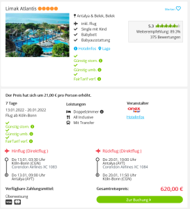 Zwei Tage vor dem Fest haben wir das perfekte Weihnachtsgeschenk für dich: Schnapp dir unseren heutigen Reise-Deal und starte das neue Jahr mit einem Luxusurlaub in der Türkei. Klingt gut? Es geht sogar noch besser: Dank kostenloser Reisestornierung oder Umbuchung bei vielen Veranstaltern kannst du einen sicheren Urlaub trotz Corona buchen!