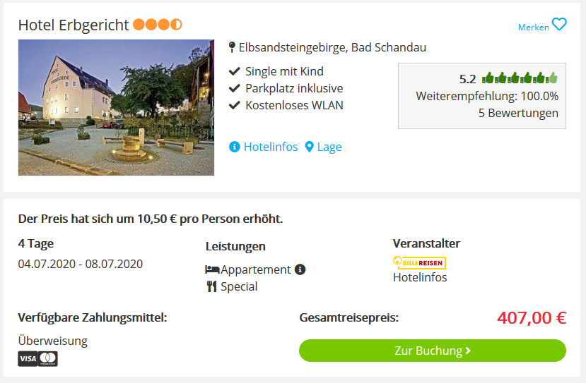 Mit fabelhaft haben Urlaubsgäste die Unterkunft Erbgericht am Elbsteinsandgebirge bewertet, stolze 100 Prozent der Reisenden empfehlen das Hotel in Sachsen weiter.