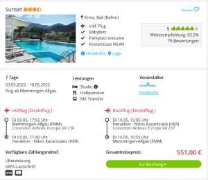 Frühbucher aufgepasst: Mit unserem heutigen Reise-Deal schnappst du dir den Sommerurlaub für 2022 zum Superpreis – genieße eine einwöchige Auszeit im Sunset-Hotel im Studio mit Halbpension und Transfer als Griechenland Urlaub unter 300 Euro! Worauf wartest du noch, pack die Koffer für deine Reise nach Kreta!